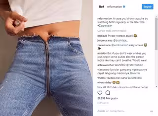 Con el sello de Reformation, una de las firmas que más triunfa en las redes sociales, estos vaqueros con tan llamativos como bizarros por la cremallera que une las dos perneras desde el ombligo a la espalda. Sí, es lo que piensa: la cremallera se abre también por la derrière o, si queremos ser más directos, el culo.