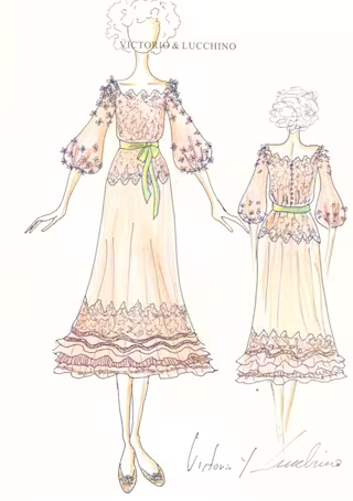 Un guiño en la cintura que se ajusta con un lazo de terciopelo de seda color verde lima. Los zapatos son unas manoletinas de encaje y gasa al tono del vestido con jazmines igual que en manga".