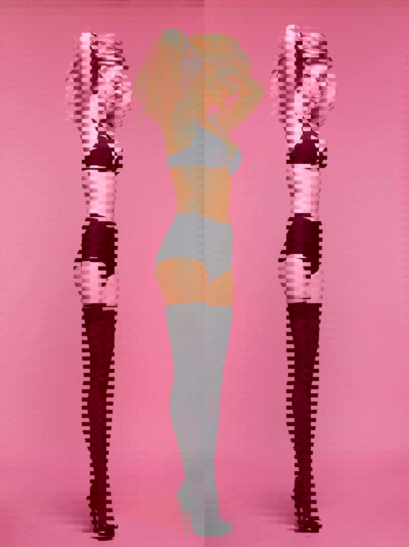 En una segunda fotografía, la modelo logró lucir sexy y eso que se trataba de una ropa interior muy alta, al estilo de Bridget Jones. Bar Refaeli posó con unos pantalones negros de malla altos que se adaptaban perfectamente a sus piernas, unas braguitas de talle alto y unos tacones. Todo ello oscuro.