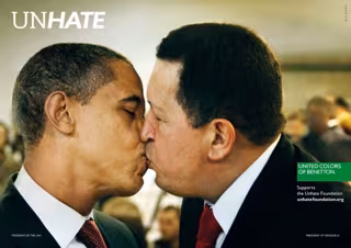 Hay que recordar también que, a parte de Benedicto XVI, en la campaña 'Unhate' de Benetton aparecían numerosos dirigentes políticos uniendo sus labios, como es el caso de Nicolás Sarkozy, Angela Merkel o el propio presidente de Estados Unidos, Barack Obama, quien aparece besando a Hugo Chávez.