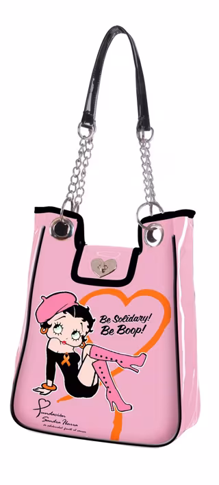 El bolso 'Be Solidary, Be Boop!' es un complemento para la mujer actual en color rosa que simboliza el color de la lucha frente al cáncer de mama en el que aparece Betty Boop luciendo un look muy femenino, sexy, con el lazo naranja de la Fundación Sandra Ibarra.