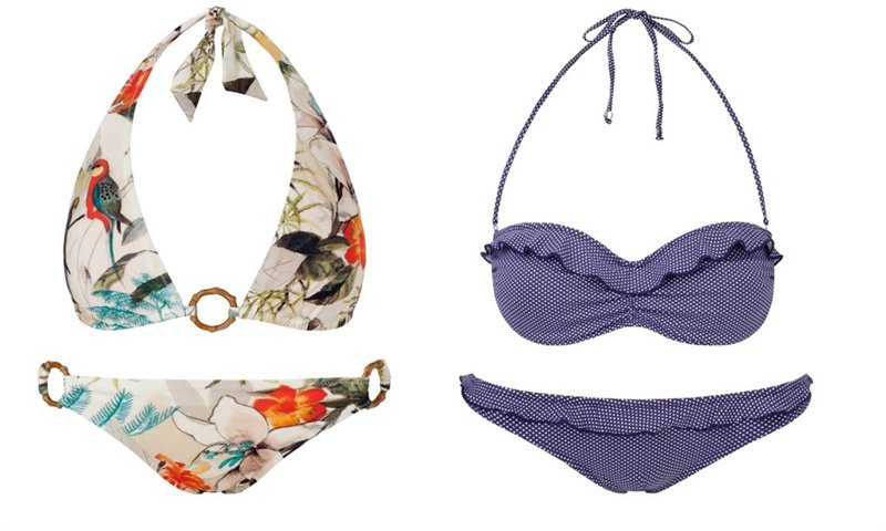 El bikini de cuello halter y con motivos tropicales y colores ácidos es el modelo Tropical Chic. También Sara ha optado por otro modelo, más clásico, Romantic de corte bandeau, color azul marino con topitos blancos y combinado con un fino y divertido volante.