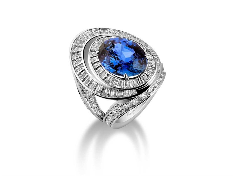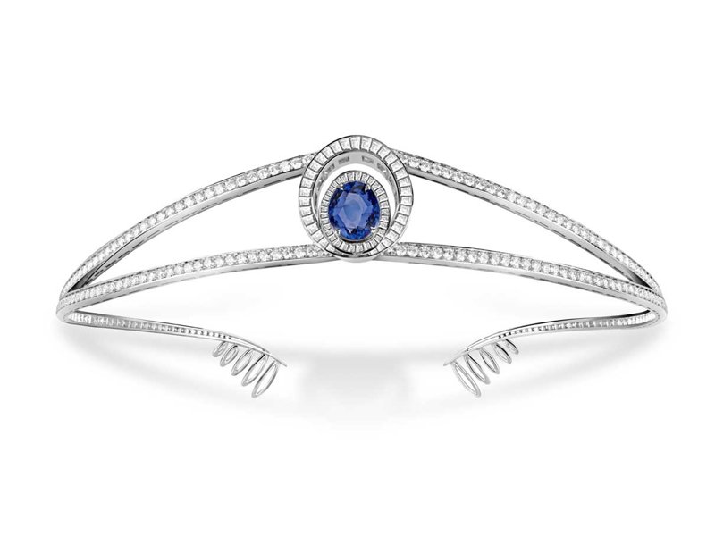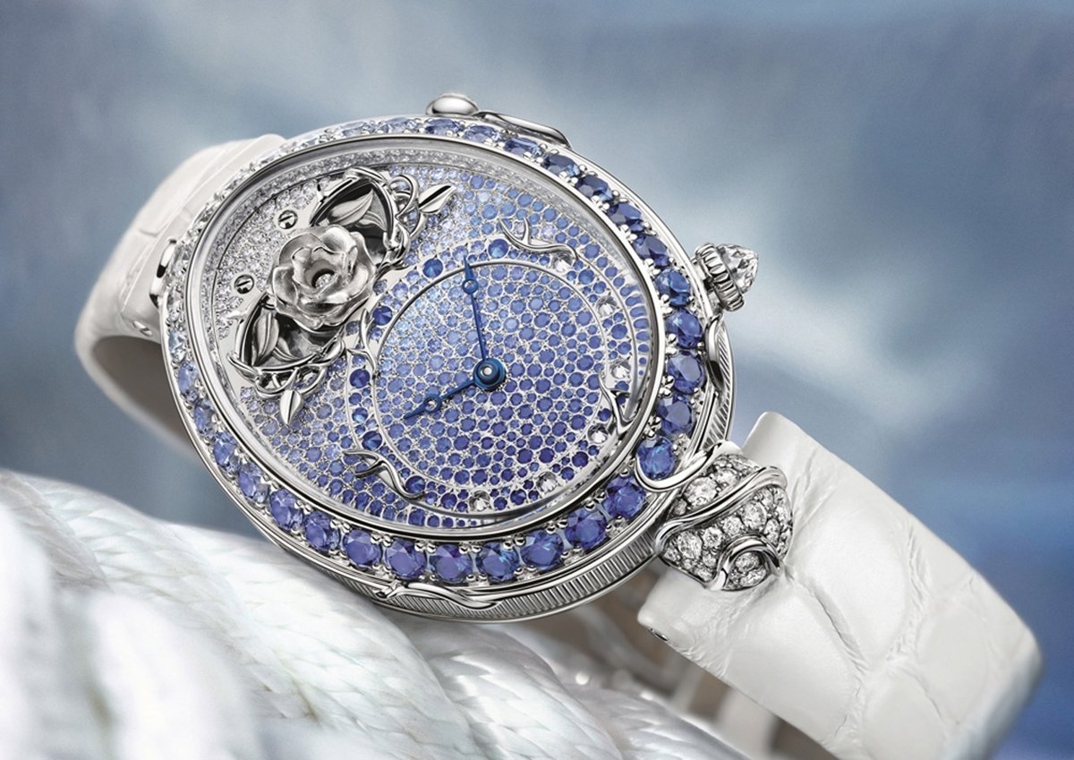 Para hacer juego con el entorno en cual es desvelada esta pieza, el bisel, la carrura y las asas del Reine de Naples especial aniversario están engastados con 28 diamantes talla brillante y 27 zafiros azules.