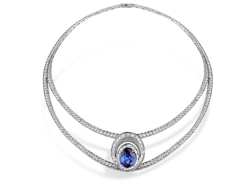 La esfera de oro plateado y su realce están engastados con 233 diamantes talla brillante y 303 zafiros de matices diferentes, ofreciendo una sutil graduación de colores. Una corona situada a las 4h, engastada con un diamante talla briolette, realza el aspecto de este reloj aniversario exclusivo, correa de cuero de cocodrilo con hebilla desplegable engastada con 26 diamantes.