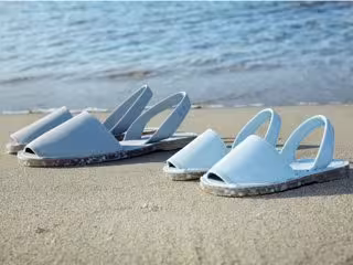 Los plásticos marinos reciclados de Seaqual Iniciative y convertidos en un material igual de manejable que cualquier tela o piel, son la materia prima que RIA utiliza para confeccionar el corte delantero del empeine, la tira trasera y la plantilla de las abarcas Eco. El piso está hecho con plástico PET reciclado y es de color semitransparente.