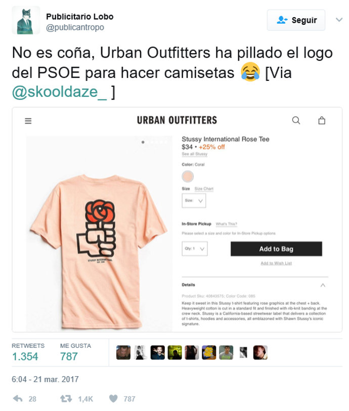 La red arde desde Publicitario lobo compartiera un pantallazo de la web de la firma estadounidense en su Twitter. A todo el mundo le sorprendía que esta marca, que es popular por su estilo desenfadado, usara un logo antiguo del partido político español para decorar una camiseta, que estaba a la venta por 34 dólares en la tallas L y XL, color salmón, antes de ser retirada del mercado.