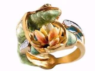 La firma Masriera presenta, para este mes de febrero, una pieza inédita y especial, un original anillo en forma de rana, que abraza tiernamente una flor de loto.