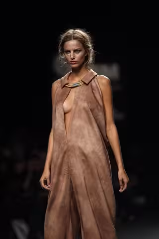 Alvarado marca las cinturas, apuesta por los hombros naturales falseados y por los largos moderados. Una colección de una precisión exquisita, donde el diseñador trabaja con todo tipo de tejidos que van desde la viscosa, pasando por el algodón, la lana fría y la rafia.