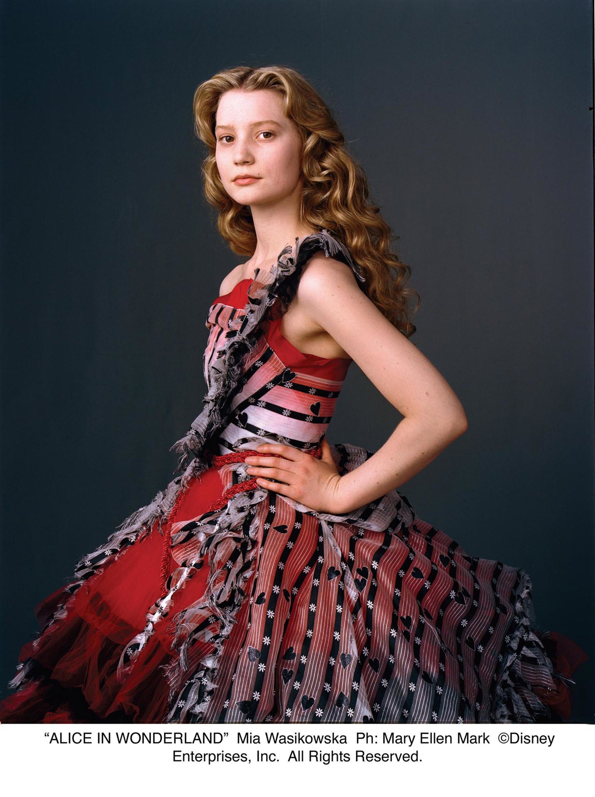 - Para ella, el mundo real empieza en una fiesta de mayores en la que se va a decidir su futuro. Es entonces cuando Alicia comprende que ese no es su verdadero destino. Para esta parte, utilicé un azul tradicional para el vestido de Alicia, con una silueta victoria. Añadí bordados en los bajos que es lo que llama la atención del conejo. El vestido es un homenaje a Arthur Rackham y John Tenniel, los grandes ilustradores. Cuando Alicia se cae por la madriguera del conejo, el mundo es el mundo de Tim Burton. Alicia crece y encoge, pero a diferencia de otras encarnaciones anteriores de Alicia, su ropa no lo hace. Cuando encoge, la combinación se convierte en un vestido que se enrolla alrededor del cuerpo. Cuando Alicia crece, esa misma combinación le explota. Durante la película, la Reina Roja y el Sombrerero Loco le dan ropa y también lleva la armadura que le da la Reina Blanca.