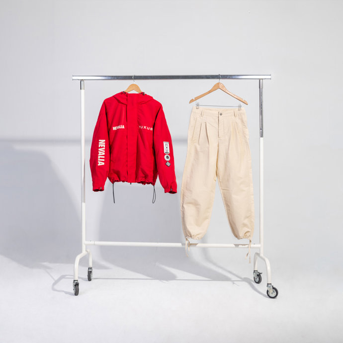 De color rojo vibrante y corte oversize es la chaqueta que protagoniza este conjunto de Yuxus x Nevalia: incorpora capucha con visera y parches exclusivos de la marca. Por su parte, el pantalón sigue la tendencia balloon pants (una de las que está dominando la moda actual).