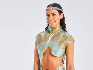 Aunque las diferencias son numerosas y el de la presentadora es más sensual y deja menos a la imaginación, su tejido -el de la artista estaba hecho de silicona-, su color -azul verdoso- y su forma estructurada en la parte superior son cuanto menos similares. ¿Inspiración o mera casualidad?