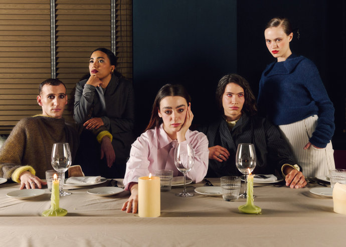 Inspirada en ese momento de transición en el que el cuerpo abandona la rigidez de la representación social, 'La sobremesa' desarrolla un lenguaje estético basado en la tensión, la deconstrucción y el gesto. Las siluetas exploran la dualidad entre estructura y movimiento mediante prendas que se abren, se desplazan o se tensan sobre el cuerpo, incorporando elementos como imperdibles, costuras expuestas y volúmenes inacabados que evidencian el proceso constructivo.