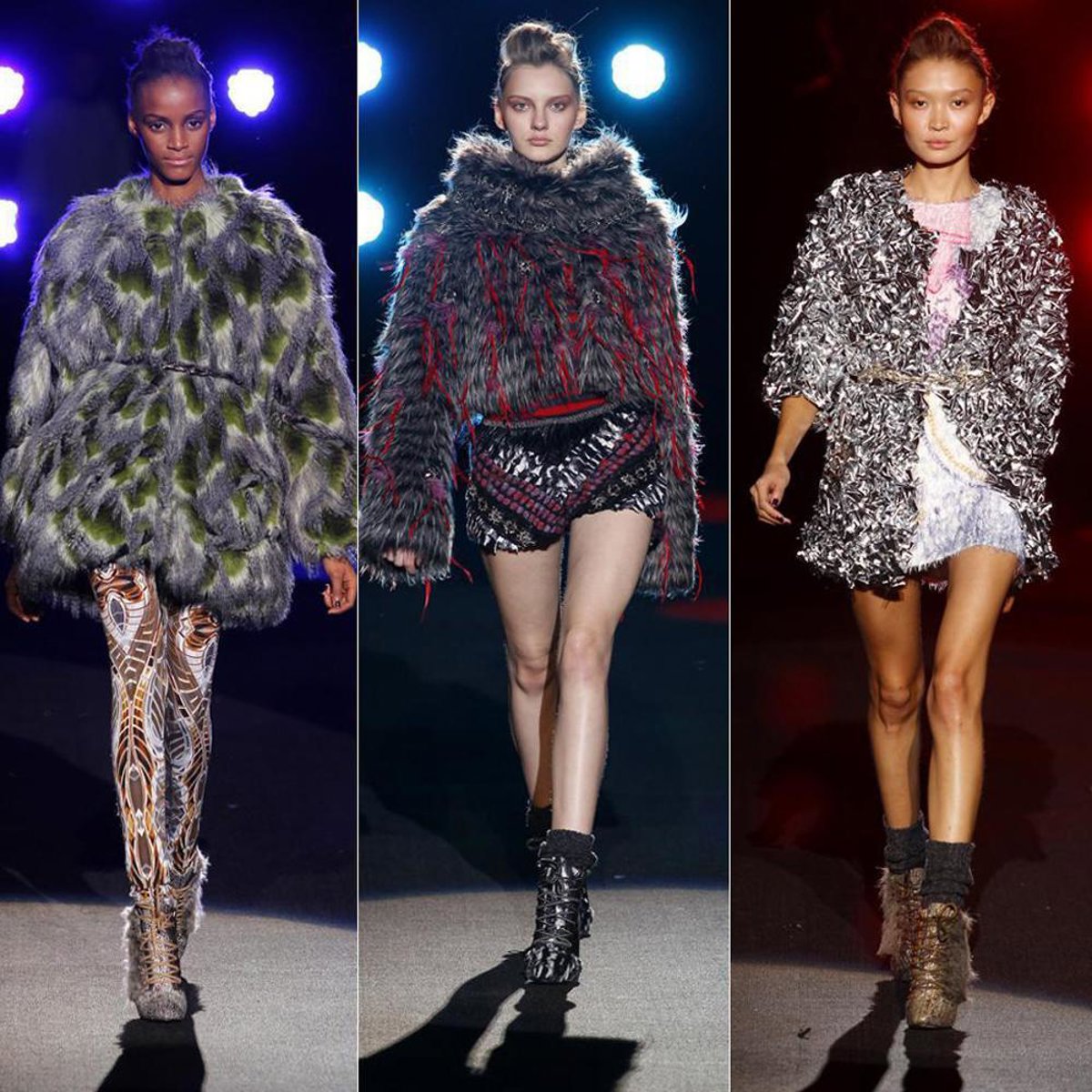 El frío de los metales se ha visto contrapuesto con el fake fur que se ha desarrollado en todas sus variantes. Pelo de distintas medidas y colores se mezclan entre sí y crean nuevos efectos gráficos: sinuosos, geométricos o cruzados.