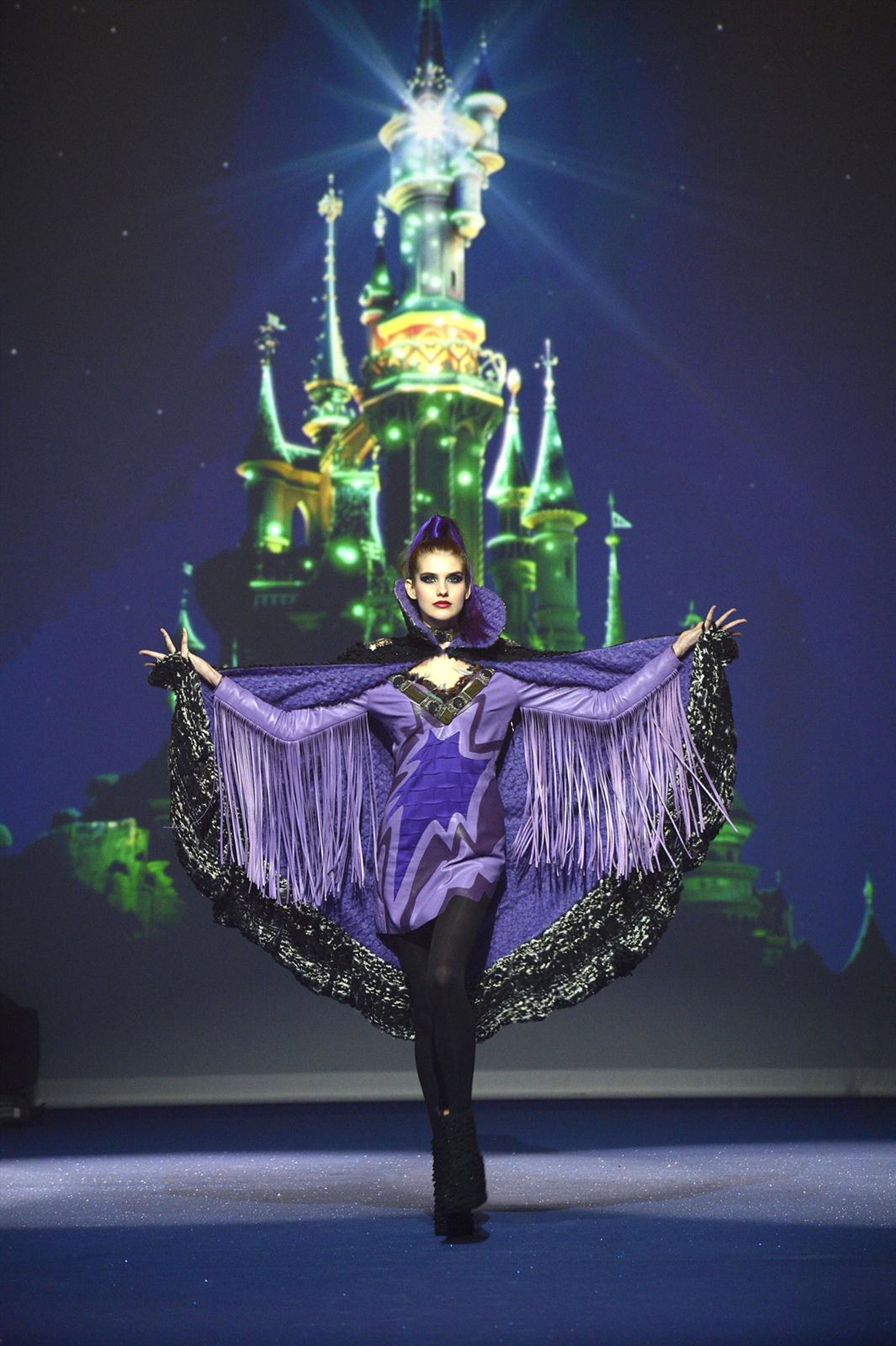 La malvada Maléfica, de la película "La Bella durmiente", ha sido el personaje elegido por Custo Barcelona, un referente de fuerza y elegancia que por otra parte será encarnado por Angelina Jolie en la película de Disney prevista para el próximo año. El look que el diseñador ha creado para Maléfica consta de un vestido de corte ajustado al cuerpo donde intervienen varios tonos de morado, realizado con patch de diferentes texturas, piel tintada en tonos morados, lanas fruncidas con origami, punto roma para la base, pasamanerías metálicas en oro y plata y flecos a lo largo de todas la mangas.