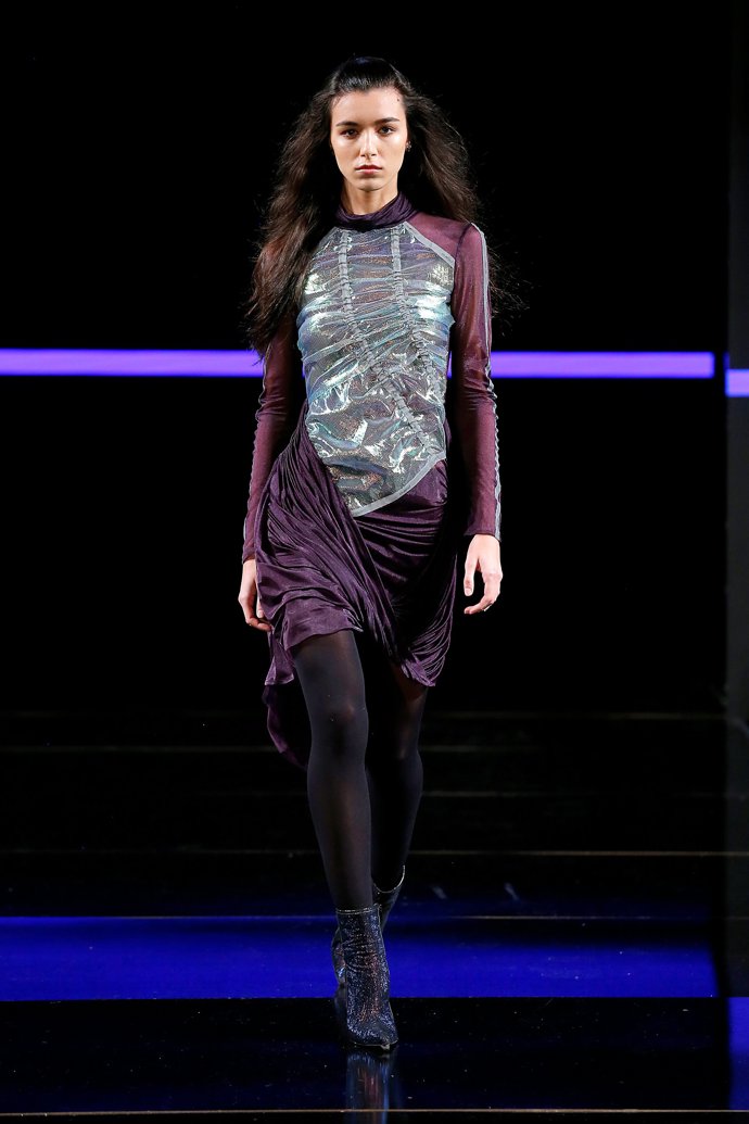Los tejidos técnicos asumen acepciones diferentes dentro de la colección y permiten la coexistencia de una fuerte inspiración deportiva con una propuesta de vestidos y looks más de noche. Los tejidos metálicos iridiscentes de efecto brillante dan la bienvenida a una parte de la colección que juega con laminados, efecto mojado, y lentejuelas, en un homenaje a la estética disco de los años ochenta. Fibras preciosas se mezclan a materiales tecnológicos en la creación de nuevos tejidos brillantes y metálicos, que resaltan dentro de la colección junto a lurex, jacquard, cuero técnico sostenible, cady de viscosa, satén y georgette.