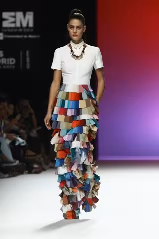 La gran ovación por parte del público ha llegado con los trajes largos. Primero, un vestido en color crema con la falda tableada y detalle geométrico y multicolor por el escote. Los flecos anchos de colorines son una arriesgada, pero muy acertada apuesta de David Delfín para la próxima temporada.