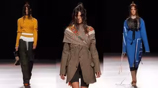 Este look beauty aportaba a las modelos un toque decadente que acompañaba a unas propuestas innovadoras en la que reinaba el estampado de cuadros escoceses, los tonos tierra y las prendas desestructuradas. El diseñador de origen cacereño pesentó un mix de influencias de lo más diverso: desde el boxeo hasta el cuadro escocés pasando por el hip-hop. El patchwork pop y los logos, tan de moda últimamente también tuvieron su hueco en la colección.