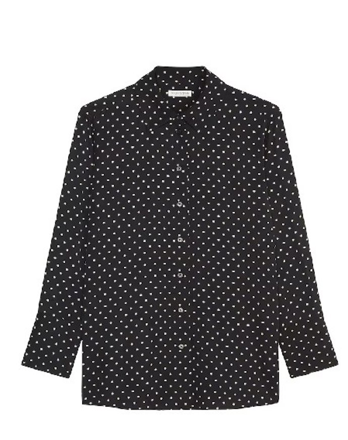En El Corte Inglés podemos encontrar una camisa elegante y desenfadada al mismo tiempo: de corte largo, mangas con puños anchos y cuello Kent, así como tapeta de botones y estampado de lunares.