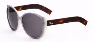 Gafas de sol de acetato, de forma ovalada y femenina, sofisticadas y retrò. La parte frontal aparece enmarcada por inteligentes elaboraciones de bajo relieve que evidencian contrastes cromáticos sofisticados, con exclusivos matices bicolores en tonalidades naturales. Las sofisticadas varillas de color habano están decoradas con el logotipo "Dior" de metal.