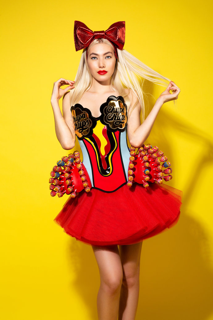 Como pieza central de la exposición se encuentra un corsé, marca de identidad de Maya. Un conjunto decorado con piezas 3D y coronado con decenas de caramelos de la marca española Chupa Chups.