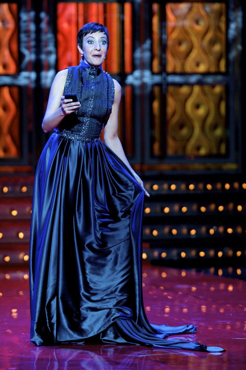 A la alfombra roja llegó luciendo un espectacular vestido negro con escote en V al hombro, firmado por Hannibal Laguna, traje al que siguieron un clásico esmoquin, uno largo en nude, otro gris ceniza con cuello cisne y sin mangas, otro tipo lady like con falda midi y estampado de ojos, uno precioso en rojo pasión y el último, negro con corpiño de esmoquin. Todos ellos para subirse al escenario de la gala.
