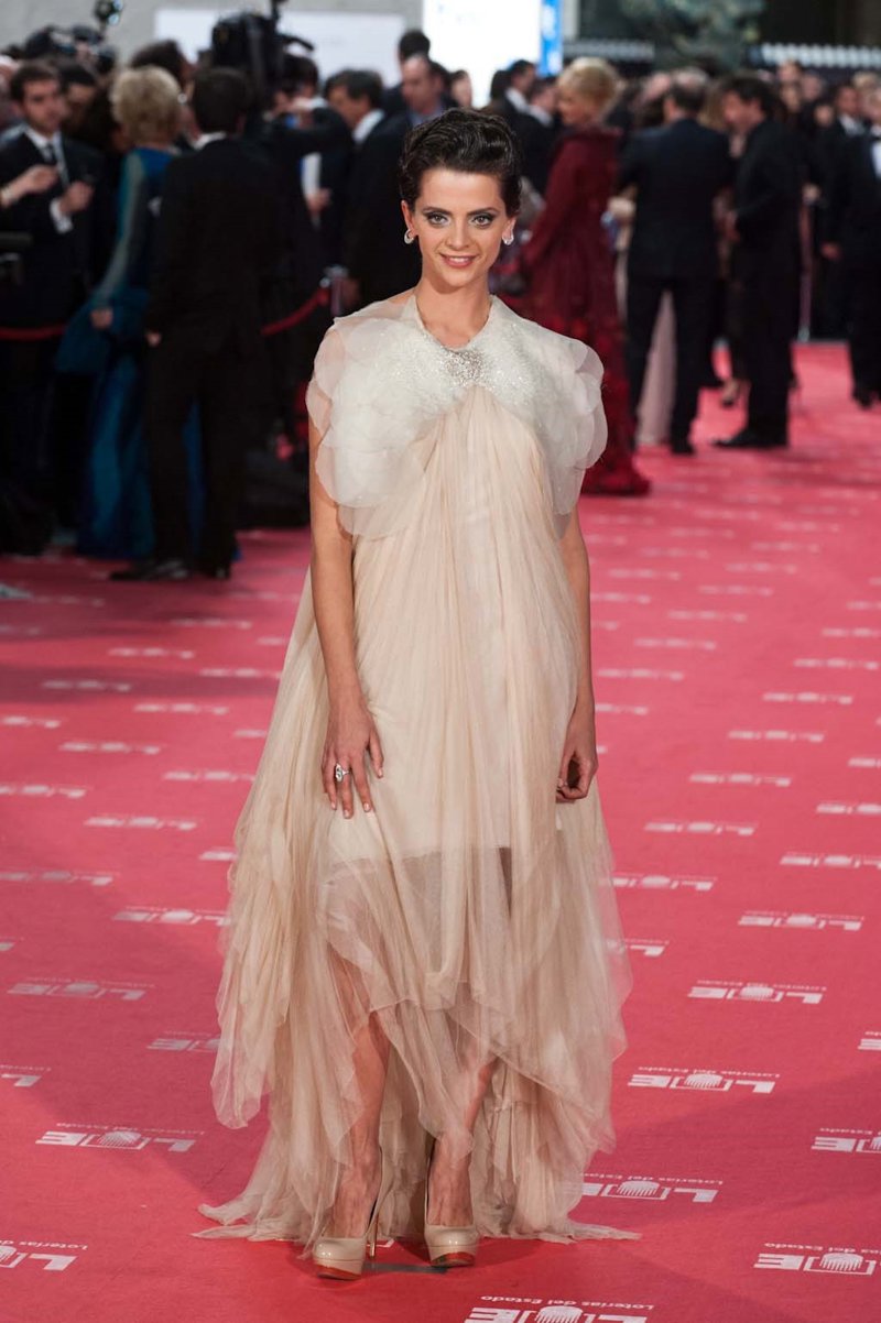 Irene Visedo escogió un vestido largo, de escote asimétrico y capa que contrastaba con su s labios rojos. Finalmente, Macarena Gómez se atrevió con este original diseño vaporoso de tules superpuestos y gasa, firmado por Teresa Helbig.