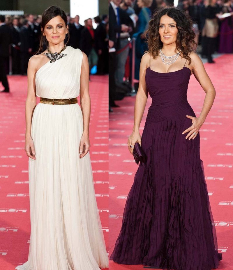 Verónica Forqué se decantó por el rojo español en un diseño de Jesús del Pozo de inspiración romana y, otra de las grandes protagonistas de la noche, Salma Hayek escogió el morado como color de su vestido de la firma italiana Gucci.