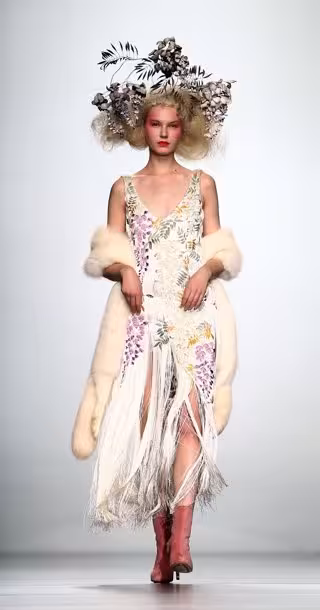 Por último, la línea rosa y blanca ha presentado también vestidos de tipo quimono con escote en la espalda y decorados con flecos, volantes, minipompones y flores. Como prenda de abrigo se han introducido los acolchados y las pieles de zorro blanco para luchar contra las temperaturas más extremas.