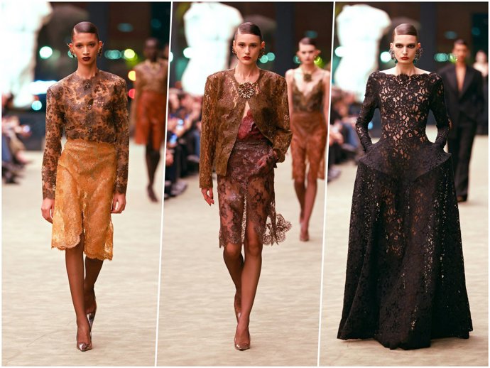 Este material aporta un contraste interesante dentro de la colección. Tras sus antiguos desfiles, en los que predominaban casi por completo los trajes y abrigos estructurados, el encaje en esta ocasión, introdujo una dimensión más delicada y sensual. El resultado fue un equilibrio entre fragilidad y fuerza que definió buena parte del lenguaje visual del desfile.