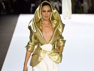 La madrileña, que cumplirá 48 años en marzo, ha desfilado con dos imponentes creaciones que, una vez más, ha defendido como solo ella podría hacer. En primer lugar, un lookazo compuesto por pantalón fluido estilo palazzo en color crema y chaqueta dorada con maxi capucha y profundo escote, ceñida al cuerpo con un cinturón con una gran hebilla a juego con el pantalón, al igual que los enormes pendientes, de forma geométrica.