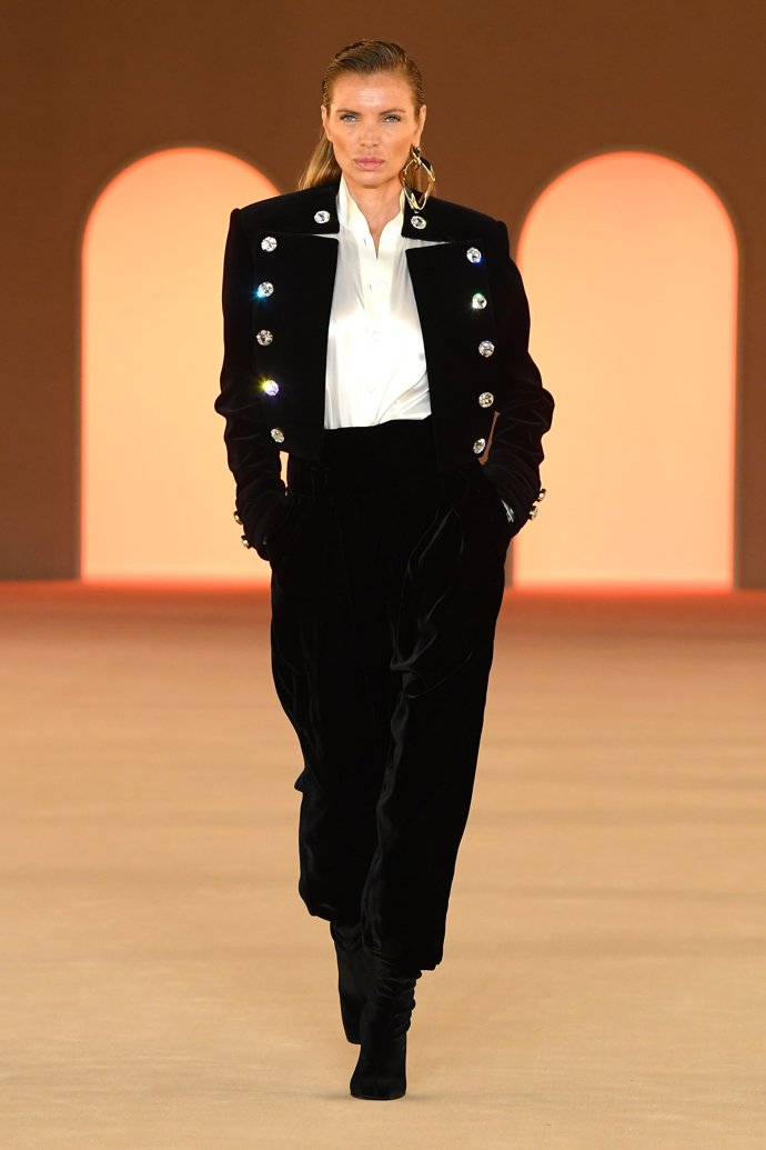 Además, Cañadas ha demostrado que mantiene la fuerza y seguridad que la hicieron única en su profesión, desfilando con una torera con grandes botones joya y unos pantalones negros y una camisa azul de seda. Prendas de la colección de Balmain otoño-invierno 2020/21.