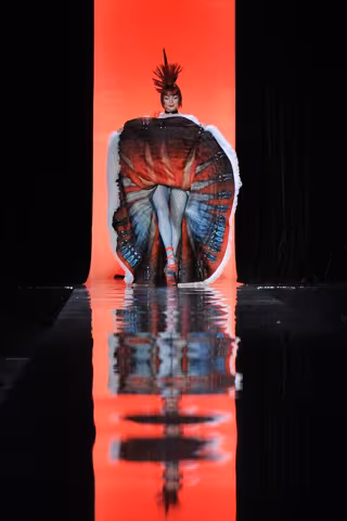 Las modelos, cada una luciendo distintos peinados mohicanos al estilo punk, desfilaron por la pasarela en la sede de Gaultier en París y bajo el sonido grabado de la voz de la actriz local Catherine Deneuve, quien iba leyendo la descripción de cada una de las piezas del diseñador.