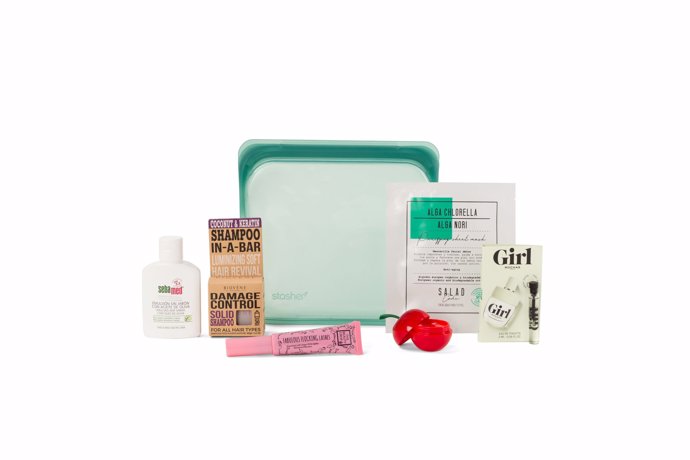 Dentro de la bolsa de Stasher podrás encontrar la máscara de pestañas waterproof de The Beauty Crop; el bálsamo labial de Tony Moly; el champú sólido de Biovene; una mascarilla facial de Salad Code; la emulsión hidratante de oliva de Sebamed y una minitalla del perfume Edt Girl Rochas.