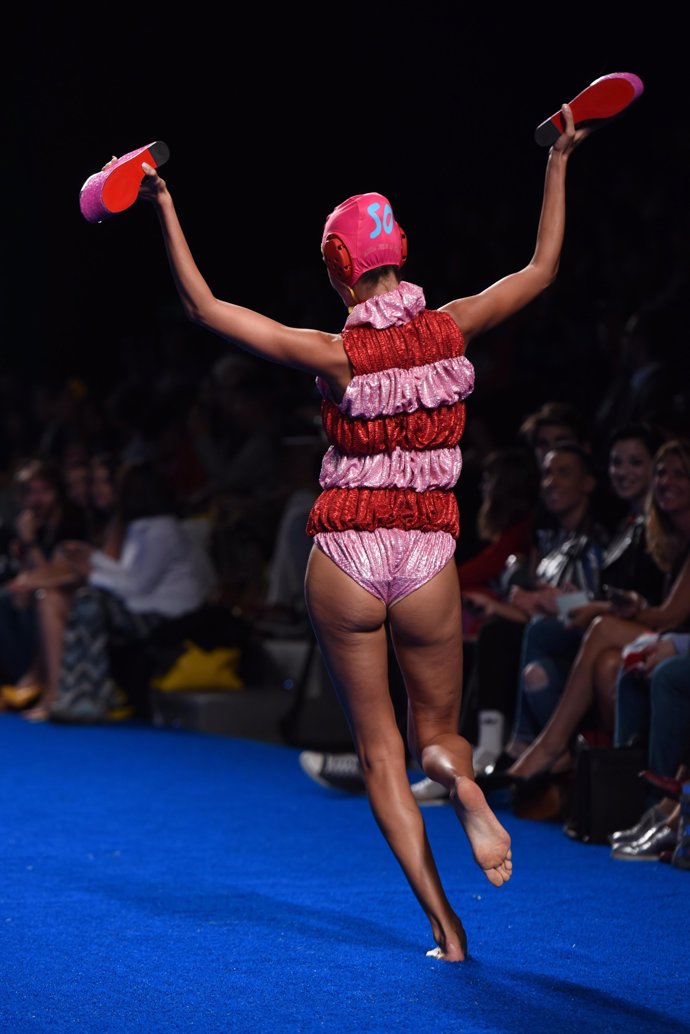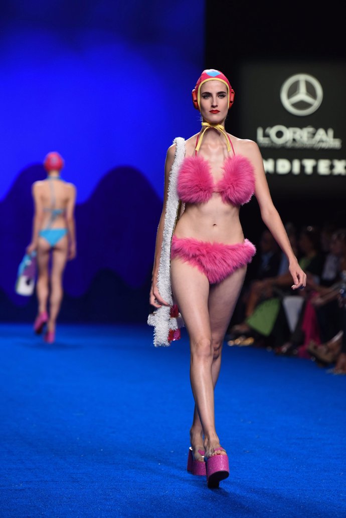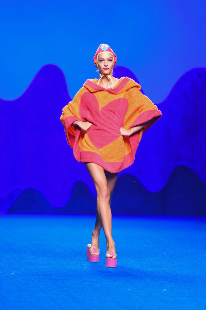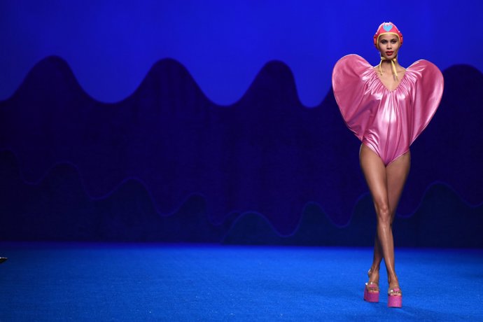 Las plataformas de PVC transparentes con suela fucsia y su icónico corazón provocaron tropiezos, como le pasó a Joana Sanz, la ganadora del Premio L'Oréal París a mejor modelo en la pasada edición, que se quitó los zapatos en mitad de la pasarela para no sufrir un Bella Hadid.