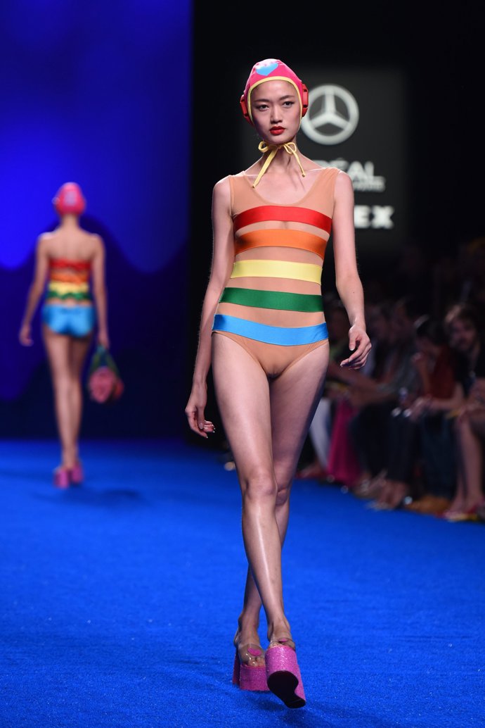 Pet Shop Boys y su pegadizo Happiness han sido los encargados de poner la banda sonora al desfile de moda baño con anclas, arcoíris que cubren el cuerpo con cintas, ladrillos, jardines e incluso sofás... ¡cualquier excusa es buena para marcar en diferencia mientras se está a remojo!