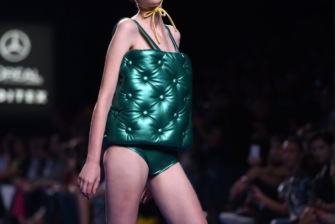En la particular pool party de Ágatha hay biquinis y bañadores con plásticos holográficos, panas, lúrexes, crin tubular, rizo de algodón, dupión de seda, peluche forrado en satén, polipieles nacaradas y de espejo, lentejuelas, metacrilatos y metal.