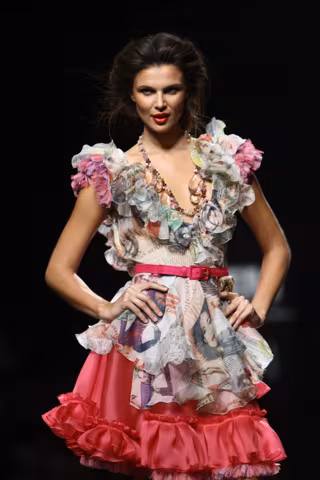 Peinetas de fantasía decoradas con estrellas, cuerpos de lycra con estampados, con asimetrías y escotes barco que se combinan con faldas de tul, volantes y mucho vuelo. Pero lo mejor está por llegar, una explosión de colores cálidos donde priman el rojo y amarillo de la bandera de España.