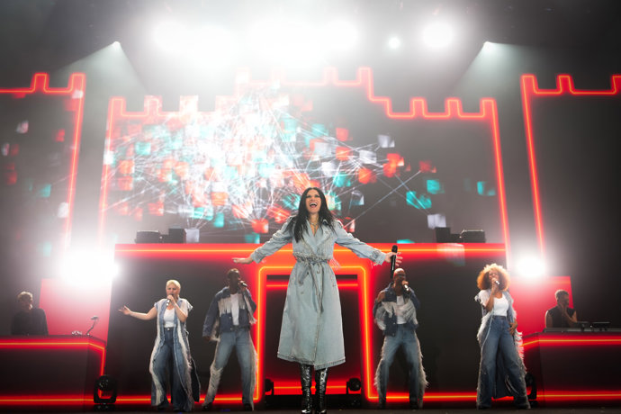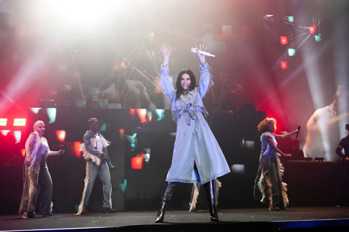 Además, no hablamos de una pieza cualquiera. La cantante eligió una gabardina denim personalizada de Desigual, con estructura marcada, solapas definidas y cinturón para ajustar la silueta, llevando el tejido vaquero a un terreno mucho más sofisticado y escénico.