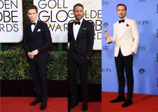 Ryan Gosling se vistió para llamar la atención con un esmoquin de Gucci confeccionado a medida con chaqueta y camisa blanca que combinó con una flor roja. Mucho más sencillos fueron Ryan Reynolds y Andrew Garfield, que se besaron en los labios para celebrar el premio del protagonista de La La Land, con sendos tuxedos clásicos y Colin Farrell, que pisó la alfombra roja del brazo de su madre, y coordinó el color de su chaqueta negra con los botones oscuros de su camisa blanca de Dolce & Gabanna, que eran los artífices de su look.