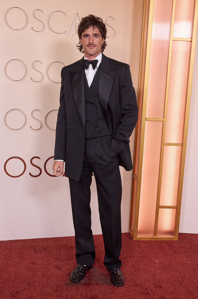 El actor nos ha vuelto a hacer suspirar con un impresionante esmoquin que destaca por una americana tipo abrigo, con maxi solapas en satén, chaleco cruzado y pajarita.