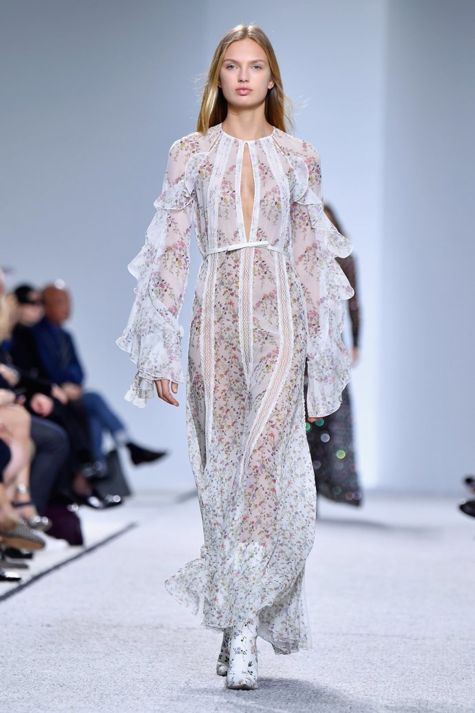 Con Giambattista Valli, el romanticismo llegó a la jornada parisina. Sus diseños tienen como punto de partida el de la lencería femenina e insinúa el pecho femenino a través de los tops con transparencias y que combina con blusas o coloca debajo de los vestidos largos y cortos. ¡Imposible no fijarse en los escotes de las modelos! Rayas, print floral, red y mucha transparencia que insinúa la silueta femenina sin perder la elegancia.