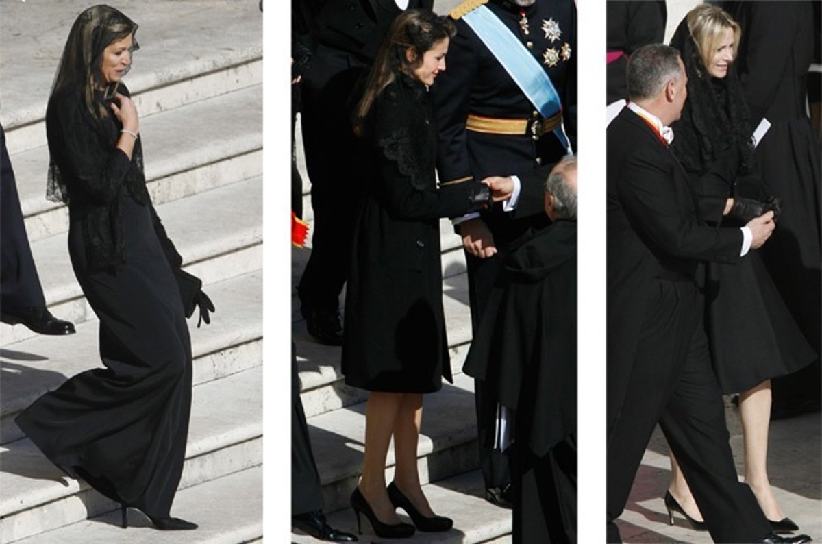 La argentina ha preferido como dress code un vestido largo con cinturón, media tupida y zapato de tacón alto acorde y guantes de media manga que llevaba en la mano, mientras que la Princesa de Asturias y Charlene han optado por un atuendo igual a media pierna con abrigo en negro sin medias tupidas negras a pesar de las críticas que la Princesa de Asturias ha recibido. Ambas, llevaban además guantes negros y Letizia, incondicional a sus plataformas utilizó unos de plataforma oculta de punta redondeada.