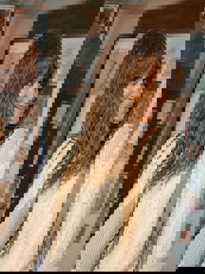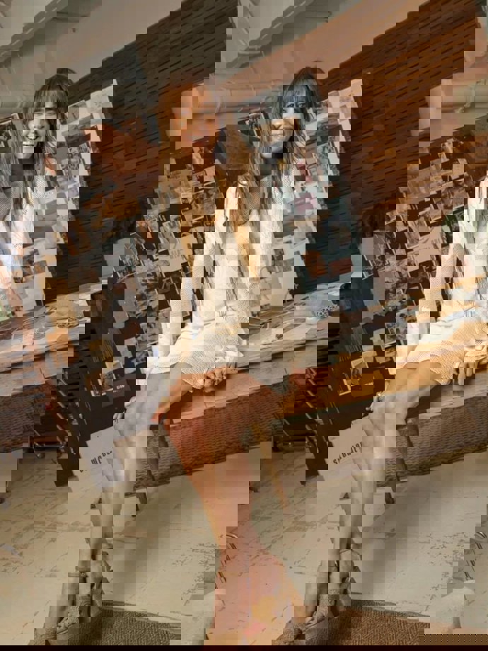 Asimismo, el corte del vestido —mini, recto y de manga larga ligeramente acampanada— equilibra perfectamente el conjunto ya que no busca el volumen en exceso, sino una caída natural que acompaña a la perfección el cuerpo. El estilismo se completa con sandalias de cuña en tonos tierra y accesorios dorados, reforzando esa paleta cálida.