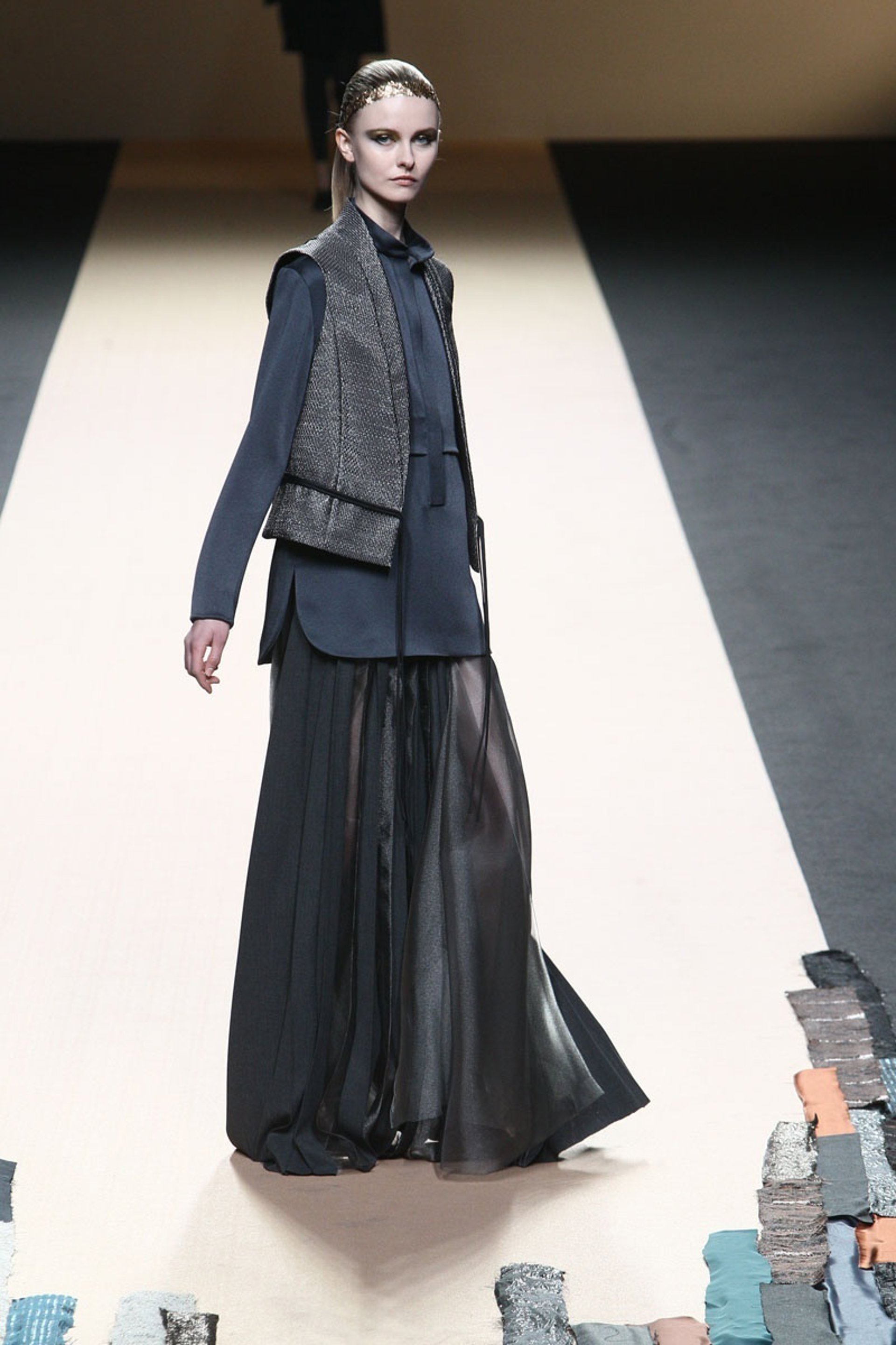 Durante el día, abrigos y chalecos en piel de cabra conviven con vaporosas faldas plisadas. Para la noche, colores más oscuros en los que también vemos el verde botella y azul en largas túnicas con formas arquitectónicas. El toque de glamour viene de la mano de las lentejuelas sobre fondos lisos y el corte sirena ha sido lo más visto.