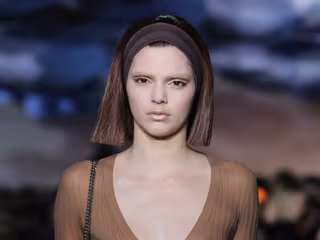 Este top transparente en tono chocolate venía acompañado de un pantalón pesquero en la misma tonalidad. Destaca el maquillaje nude que lucía Kendall al igual que las otras modelos dotándolas de cierta palidez y sobre todo la peluca que llevaba la hermanastra de Kim Kardasian, con ese corte tan recto.