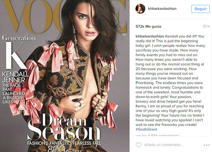Kendall estaba muy emocionada con la noticia, no así su familia, que mientras la modelo corría por su casa buscando con quien comentar su último gran logro, nadie se paraba a charlar con ella. Eso sí, la revista no ha pasado desapercibida para el clan, que la ha usado como pisapapeles o asiento para la pequeña Penélope.