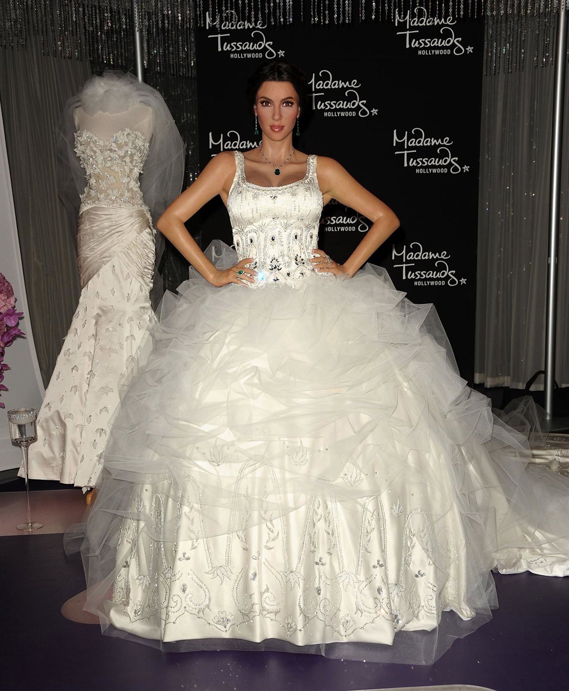 Pero eso no quitó que se volviera a cambiar de vestuario. Ya entrada la noche, la recién convertida en mujer de Kris Humphries lució un nuevo Vera Wang en tono marfil, hecho de satén y crepé en la espalda, con escote en V y falda plato.