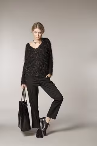 Mezcla de tejidos en prendas sobrias; todas ellas en una gama de colores lisos, destacando el azul, negro, beige y el granate.
