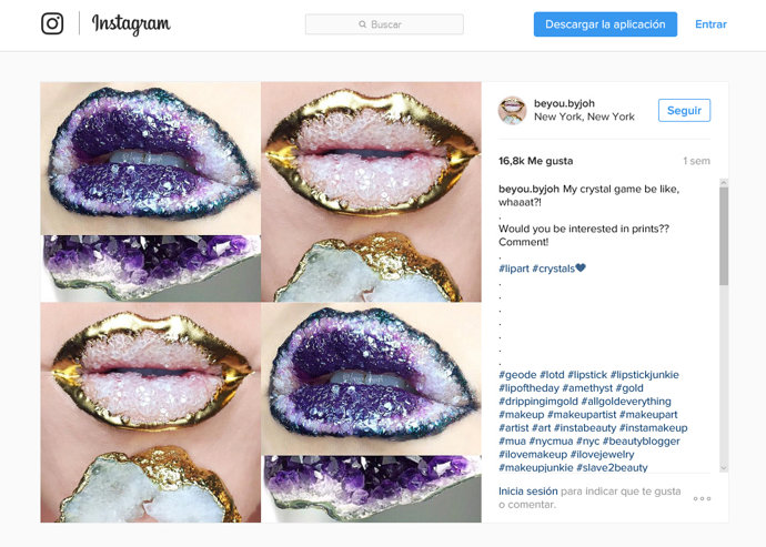 Desde @beyou.byjoh ha revolucionado la red social con sus recreaciones de amatista en los labios. Después de que Bella Hadid y Naomi Campbell lucieran labios glitter hace unas semanas, ésta es otra prueba que confirma que este temporada los labios van a dar mucho de lo que hablar.