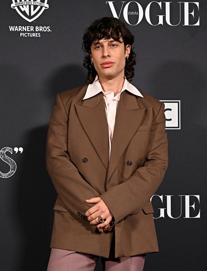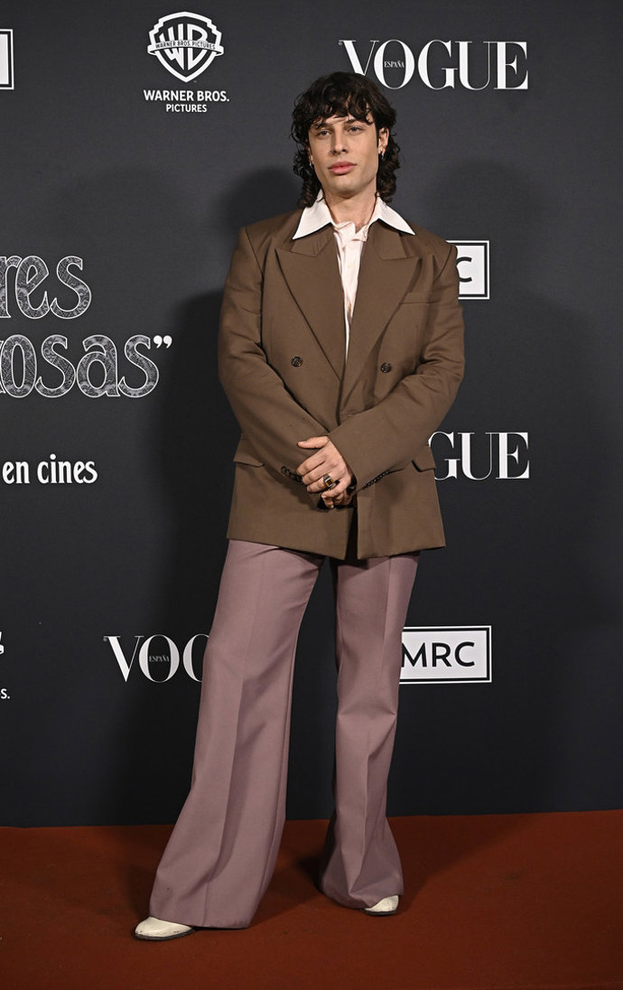 En la alfombra roja de 'Cumbres Borrascosas', el joven quiso marcar la diferencia con un look ochentero que reafirma una de las tendencias más marcadas del momento: pantalones campana y americana oversize de doble botonadura en color marrón chocolate, que combinó con camisa con cuello picudo que nos hacen viajar al pasado con un toque contemporáneo.